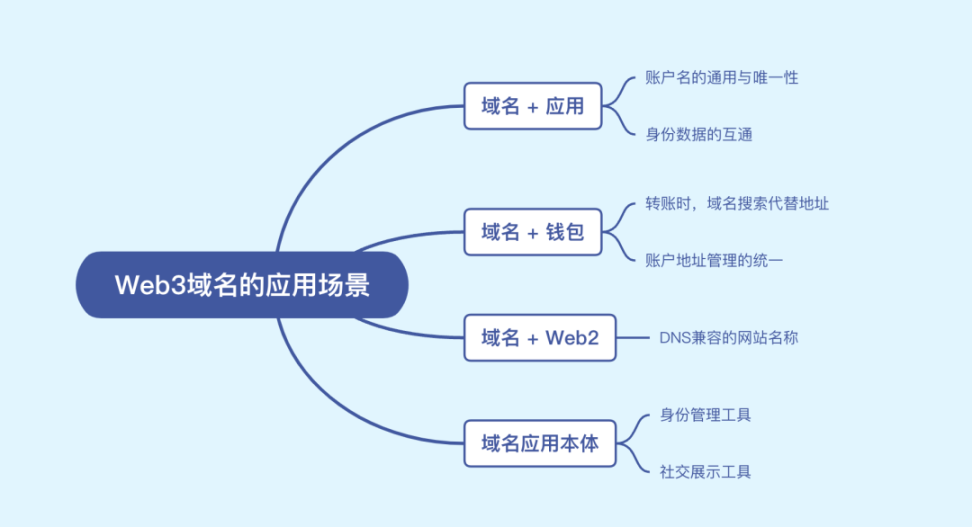 域名主要有四大类应用场景:域名 +dapp 应用,域名 + 钱包,域名 +web2 和域名应用本体