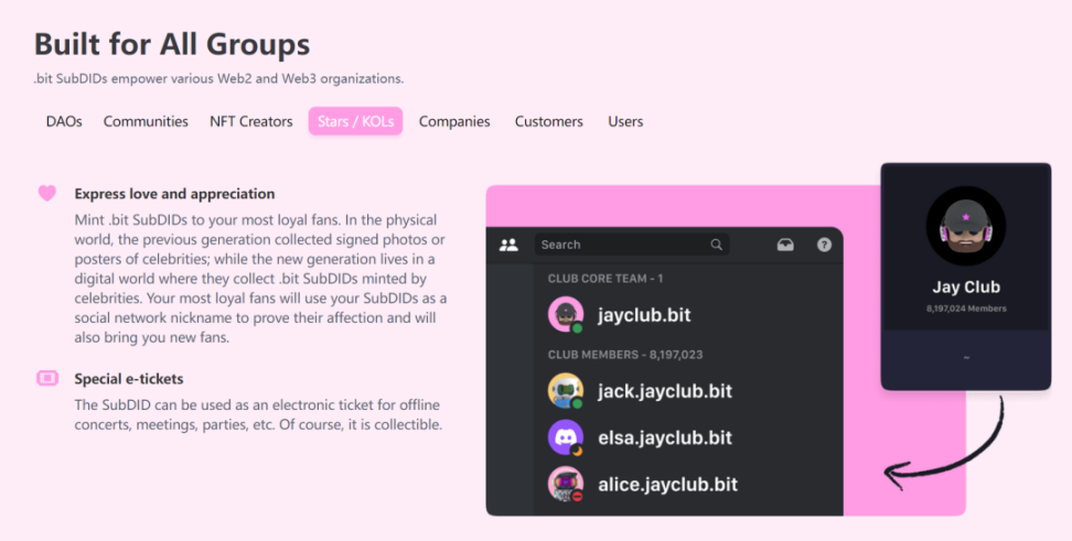 如:假设周杰伦持有 jay.bit 账户,那么周杰伦就可以自主创建 jay#fans001.bit 、jay#fans002.bit 等子账户发放给粉丝。子账户与父账户除了功能无差别外,子账户的定价权由父账户决定,如 jay.bit 可以决定 jay#fans001.bit 售卖多少钱,这样有效管理了子账户的炒作、滥用等目的。同时子账户可以为主账户续费以保证主账户的安全。这种玩法有点类似目前提的比较多的 SBT