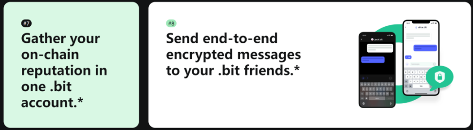 .bit 第二个亮点是充分支持去中心化服务。.bit 目前除了可以在官方的 did.id 上进行注册,同时也可以通过 DeName(中国)、mybit.jp(日本)、COCH(印尼)、das.la 等服务商进行注册,因为 .bit 的智能合约允许第三方交互,服务提供商可以通过调取 .bit 的智能合约数据资源自主打造相关注册或数据服务,与此相比 ENS 等产品目前是无法做到这种去中心化支持的
