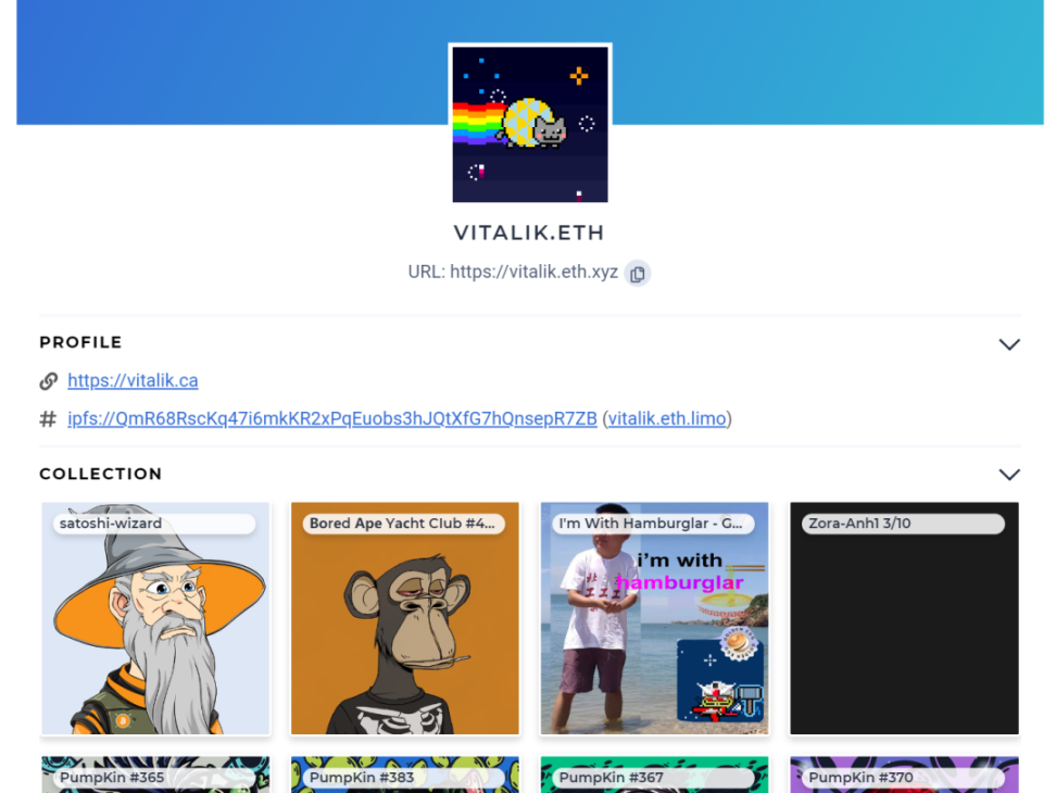 虽然“vitalik.eth”不能够直接被输入浏览器中被解析,但诸如“vitalik.eth.xyz”“vitalik.eth.link”就可以。读者不妨也试一试,比如往浏览器中输入“vitalik.eth.xyz”,就可以看到 Vitalik 默认生成的 ENS Profile;输入 vitalik.eth.link”,就可以看到 Vitalik 的个人主页