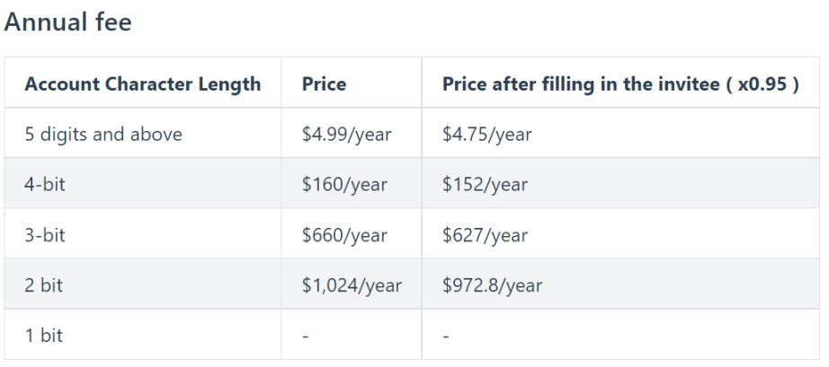 按照每年 5 美金 / 单个域名计算,ENS 上注册一个域名每年需要支付 5 美元的订阅费,.bit 的注册费 = 年费 * 注册期长度 + 存储费,最便宜的年费为 4.99 美金 / 年