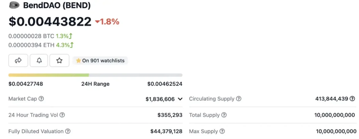 BendDAO raised 10% of the total funds for token valuation through IFO (3000ETH ). There are currently 1.5 billion $BEND tokens in circulation, representing 15% of the total supply. Bend’s current market price is 0.004, which is lower than the IFO pricing with a market value of 1.82 million (0.009).