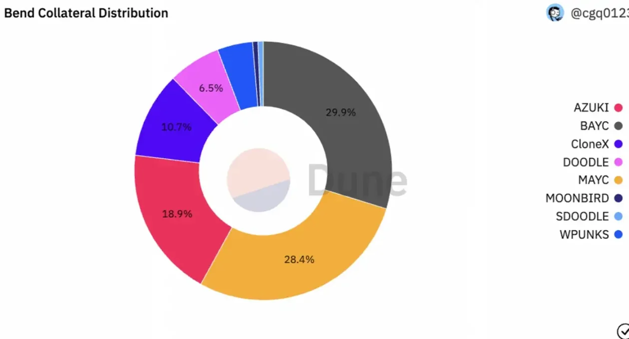 Right now, BendDAO supports 8 blue chip collections, they are Cryptopunks, BAYC, Doodles, MAYC, Azuki, Space Doodles, Clone X and Moonbirds. Each collection within BendDAO has a distinct leverage loan ratio; Cryptopunk and BAYC have 40%, while the rest have 30%.