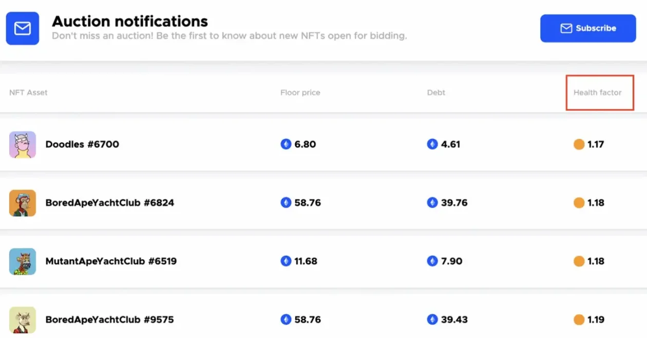 The health factor is designed for checking the overall risk level for a colleratal NFT