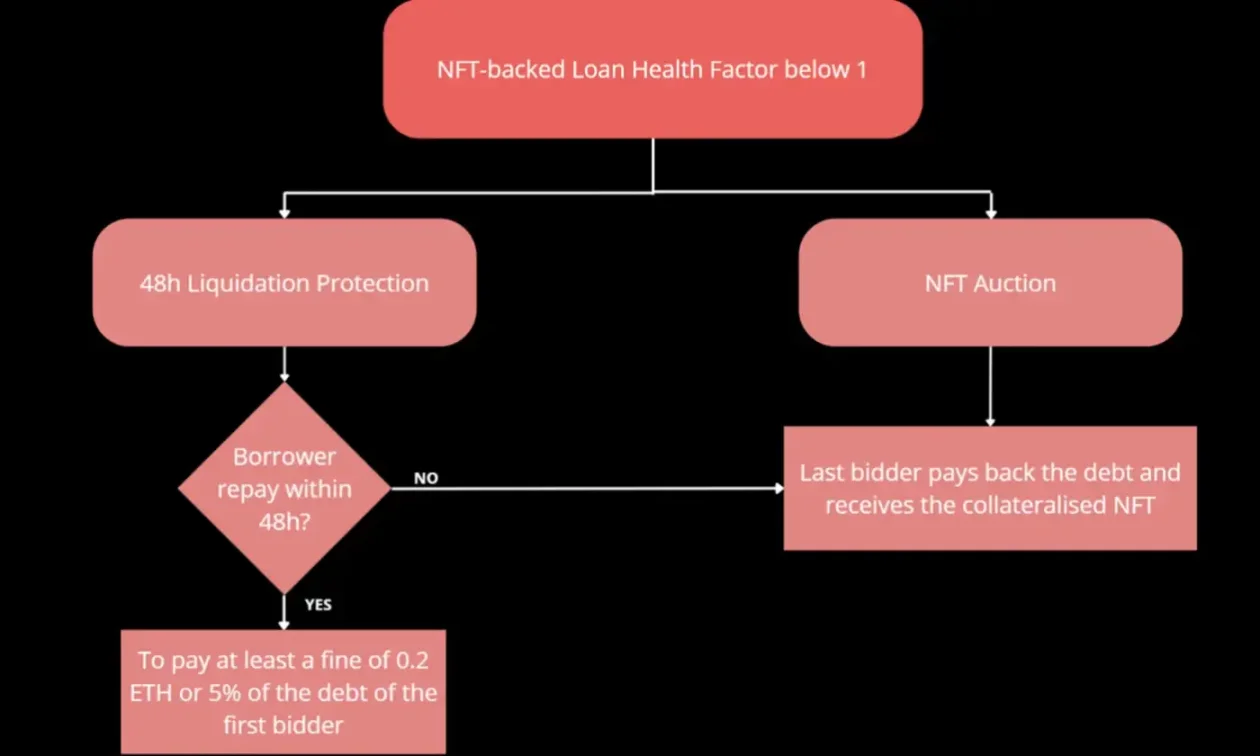 If the current BAYC floor price is 100 ETH and you lend 40 ETH as collateral, the liquidation mechanism will be triggered when the BAYC floor price falls to 44 ETH because the project’s health index is less than 1.