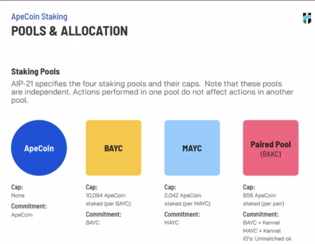 Since Yuga Labs is about to open the staking function at the end of 2022, users who hold BAYC, MAYC, BAKC and \(APE are open to staking to earn income. Since some staking pools of Yuga Labs need to hold both NFT and \)APE tokens (as shown in the figure below), the BendDAO community proposes to develop asset matching based on this staking function, so as to solve the problem that some users only have $APE without NFT or only NFT,