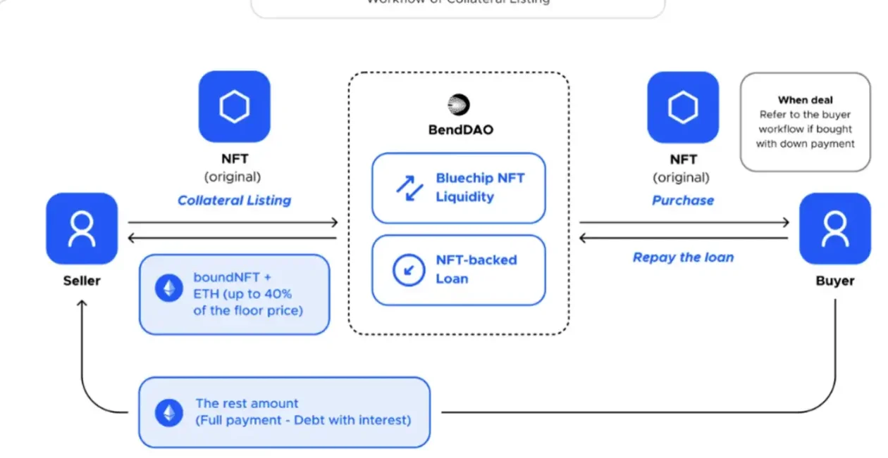 Through the use of Collateral Listing, NFT holders or sellers have the option of taking out an immediate NFT-backed loan and receiving up to 40% of the floor price instantaneously when listing their assets for sale. If you are already a borrower on BendDAO, then you will have the ability to post the collateral whenever you see fit. After the Collateral Listing, the user will transition into the role of both the borrower and the seller on BendDAO.