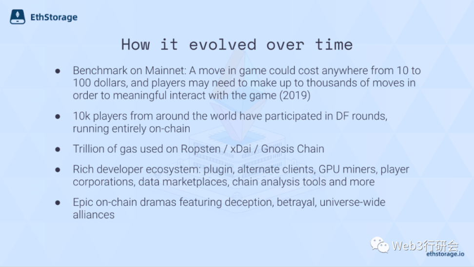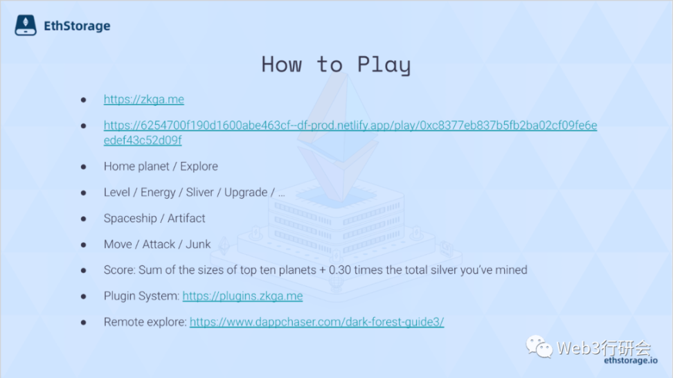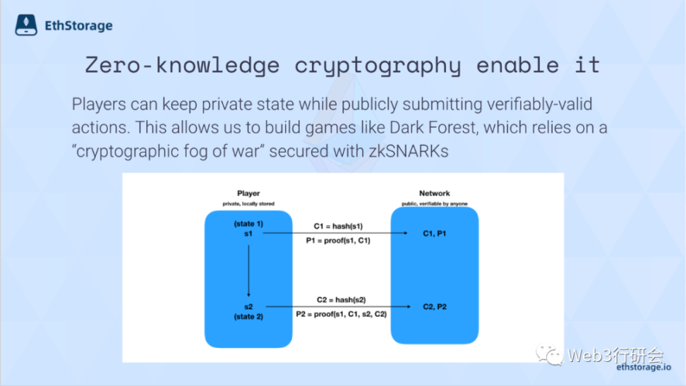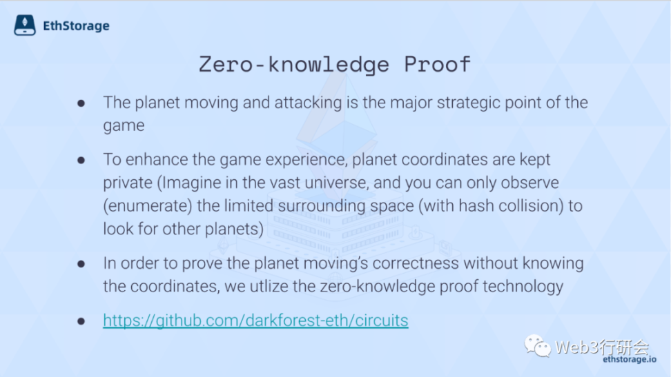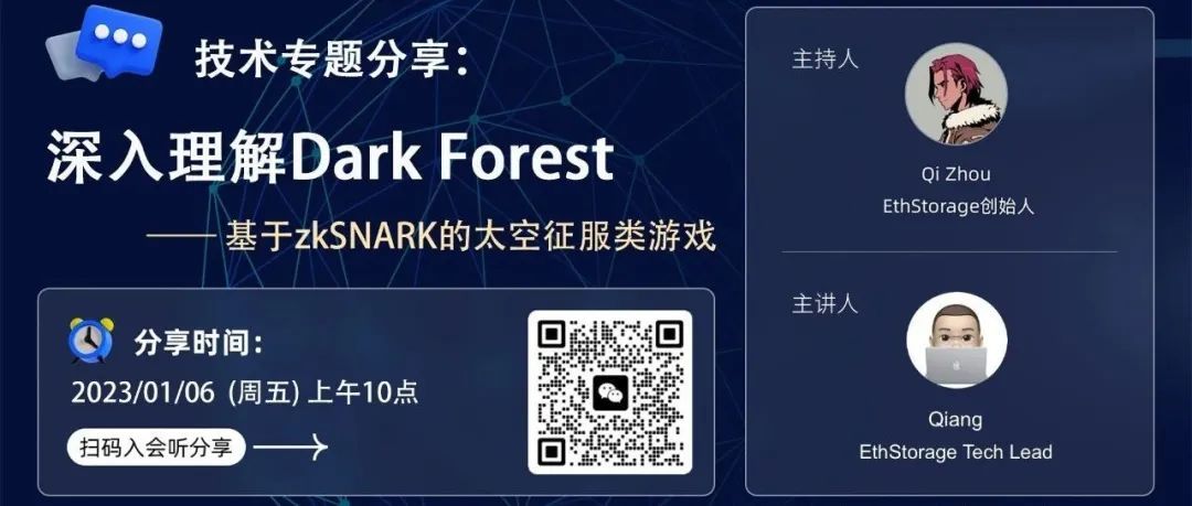 2023 年 Web3 行研会的第一场分享,由 EthStorage Tech Lead @Qiang 给大家带来“深入理解 Dark Forest —— 基于 zkSNARK 的太空征服类游戏”!同时,我们也邀请到 zkpDAO、夹熊饼干 alpha 社区、马里奥 GameFi 社区、午后狂睡 alpha 社区的成员前来参与,共同探讨交流!很遗憾本次的分享录制过程中出现一些问题,所以能呈现的只有后半部分的分享。本期的精彩内容欢迎观看:下面为分享的完整 PPT(链接为:https://docs.google.com/presentation/d/1cefkDoEkGcEwk567agmueRCZ4rkQMEpM7ympgTJo0Gw/edit#slide=id.p):