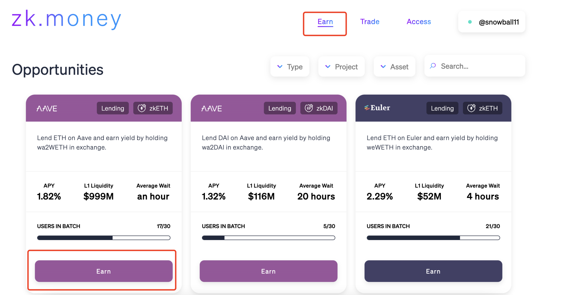 点击 Earn,选择一个质押进行操作,这边我们选择的是第一个