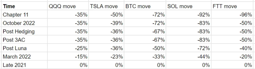 但 11 月的崩盘是对 Alameda 持有资产的有针对性的攻击,而不是广泛的市场波动。在 11 月的几天里,Alameda 的资产下跌了大约 50%;BTC 下跌了约 15%——只有 Alameda 资产的 30%——而 QQQ 根本没有动。结果,Alameda 在那个夏天最终设置的更大的对冲并没有起到任何作用。当年的每一次崩盘都会如此——但这次不会。