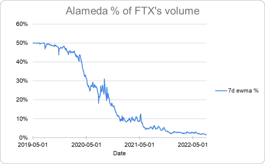虽然 FTX 的流动性从 2019 年开始主要依赖 Alameda,但到 2022 年它已经大大多样化,Alameda 在 FTX 交易量的占比下降到 2% 左右。