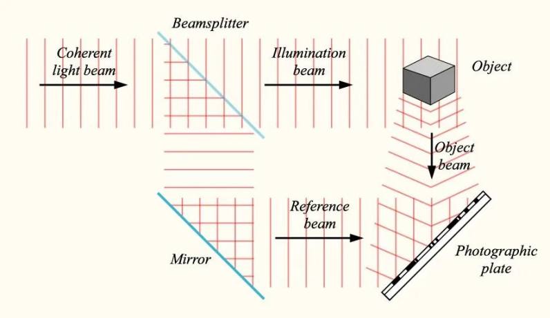 普通的摄影技术只有一道照射物体的散射光作为入射光与底片发生反应(极度简化为一道光,实际上有很多,也可以理解为一个批次),通过感光材料对光强的反应,记录光的“振幅”,而无法捕捉到“相位”信息。而全息摄影则加入参考光以“干涉”方式记录,将“相位”信息记录在干涉条纹中。“参考”光,顾名思义,就是要设置一个参考,一个参照物,这样才有相应的对比。普通的摄影方式在前景物体后面放另一个物体作为背景表现出前后关系,而全息摄影,以另一束光作为参考背景,用以还原拍摄时的光场。底片上的干涉条纹中包含了物体的全部光学信息,“全息”之名也就顺理成章了。