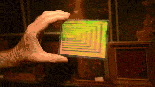 经过曝光,干涉条纹被记录在感光底片上;将底片冲洗后,干涉条纹会变得更加明显,用参考光从同一角度去照射底片,与这些明暗相间的条纹发生衍射,便“召唤”回了拍摄时的振幅、相位等光学信息,重建了光场,就形成了物体的虚像,人眼也就可以识别到当时拍摄的物体了。