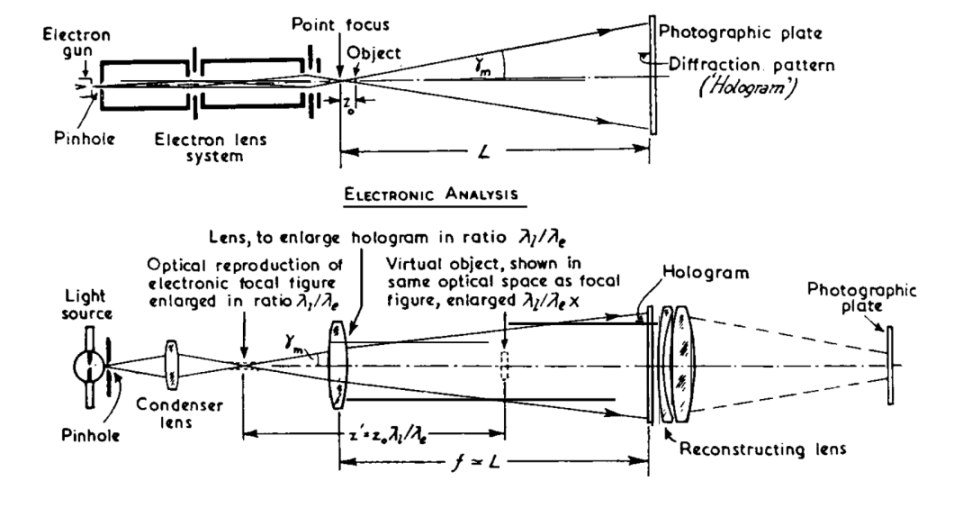 加博尔在 1949 年提交给英国皇家学会的全息显微镜构想,来源:Dennis Gabor Nobel Lecture在获得了一些成果后,由于种种技术限制,实践难以推进,加博尔对于全息技术的研究也在 50 年代初暂时停滞。加博尔本人也感叹:“我们开始的太早了。”