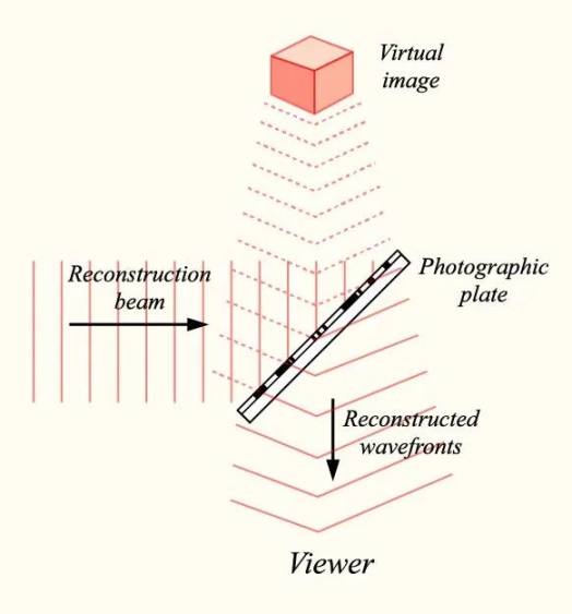 全息摄影再现示意图,来源:wikipedia这些干涉条纹对于人眼来说,只不过是一堆毫无意义的波纹,而对于光来说,它们却像“说明书”一样,指挥了光该往哪走,该做什么。