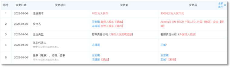 而此时,细红线科技将注册资本也已从 10 万元增至 1 亿元,冯遥遥卸任法定代表人、执行董事,由王威接任;大股东变更为 ALWAYS ON TECH PTE.LTD. ,企业类型也由此变更为“有限责任公司(外国法人独资)”。