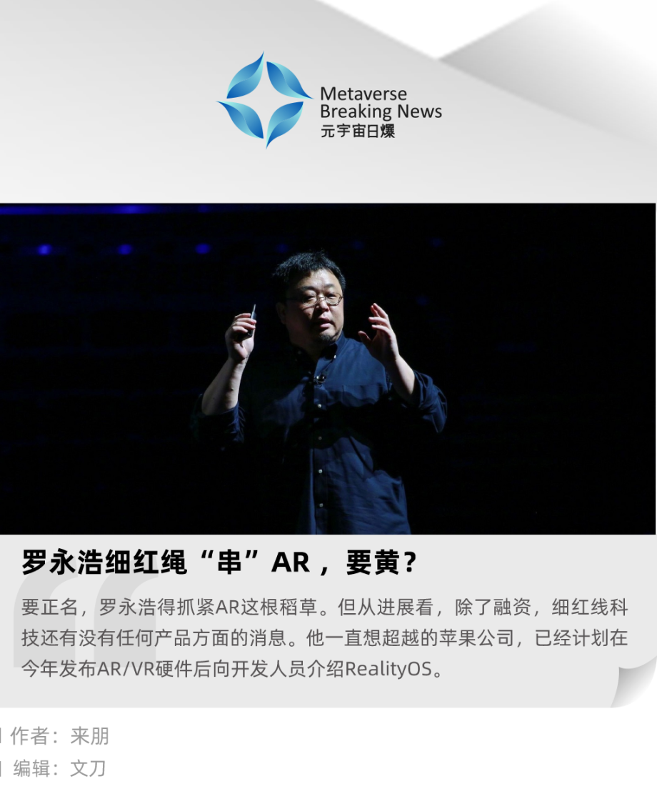要正名,罗永浩得抓紧 AR 这根稻草。但从进展看,除了融资,细红线科技还有没有任何产品方面的消息。而老罗想要攻坚的 AR OS 操作系统赛道上,Meta 已在去年投降,而他一直想超越的苹果公司,已经计划在今年发布 AR/VR 硬件后向开发人员介绍 RealityOS。