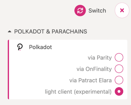 选择 Polkadot & Parachains 然后选择“lightclient (experimental)”选项,如下所示。
