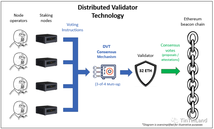 分布式验证技术,Distributed Validator Technology(简称 DVT) 类似于共识投票的多重签名,它能允许以太坊 PoS 验证器在多个节点或机器进行,从而验证者可以在多个节点进行投票,支持以太坊验证其分布式操作是该技术的核心目的。这一技术最早出现在以太坊基金会成员的研究论文中,原被称为 SSV。通过 3-of-4 设置(概念见下),DVT 允许个人、团体或者社区的节点共同组成单个验证器。DVT 通过为验证者增加容错层,提高容错率,在验证过程中,某一节点出现故障,验证器依旧可以继续运行,从而消除了单点故障、双重签名惩罚、分叉惩罚的可能性。