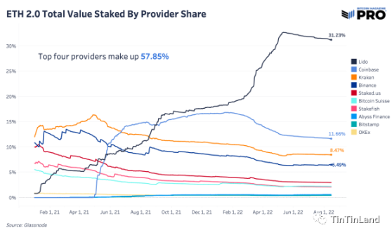以太坊规则规定持有不足 ETH 数量小于 32 的用户将被限制维护验证器,对于这些用户而言,质押服务是唯一解决方案,这进一步导致大量加密资产被储存在中心化交易所。以太坊最大的质押服务商 Lido Finance 存入了超过 400 万个以太币,占质押加密资产总量的 32%。当大量加密资产被存入交易所时,黑客攻击、不合理的审查制度、技术错误都会威胁以太坊生态,造成集中化风险。