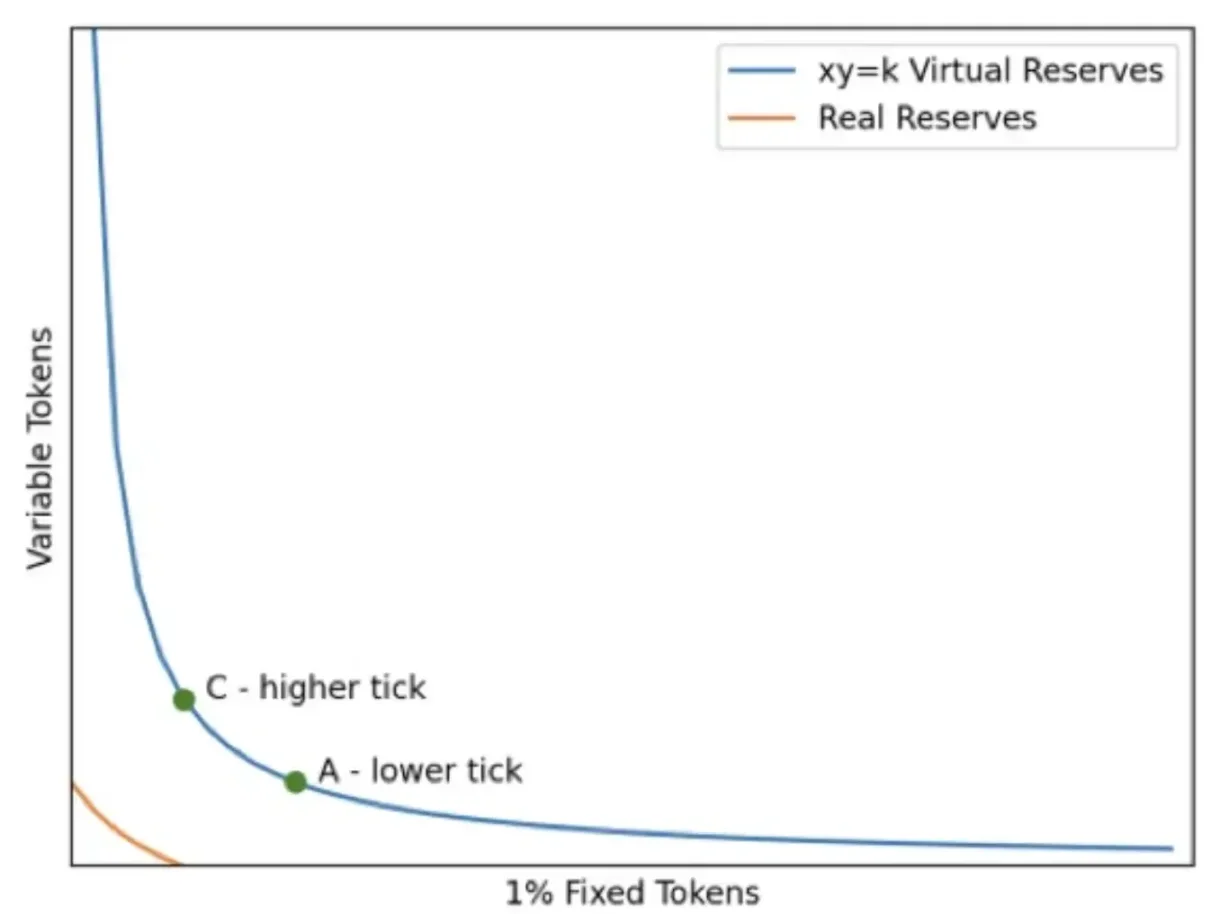 The main reason for using 1% Fixed Tokens as a parameter in the AMM is to facilitate the use of 100% interest rate conversions. As a result of the Uni V3 pricing model, LPs can choose the range of fixed rates that they are comfortable with when making a market, in other words the range of fixed rates that they can afford to pay when trading with a Trader on a counterparty basis.