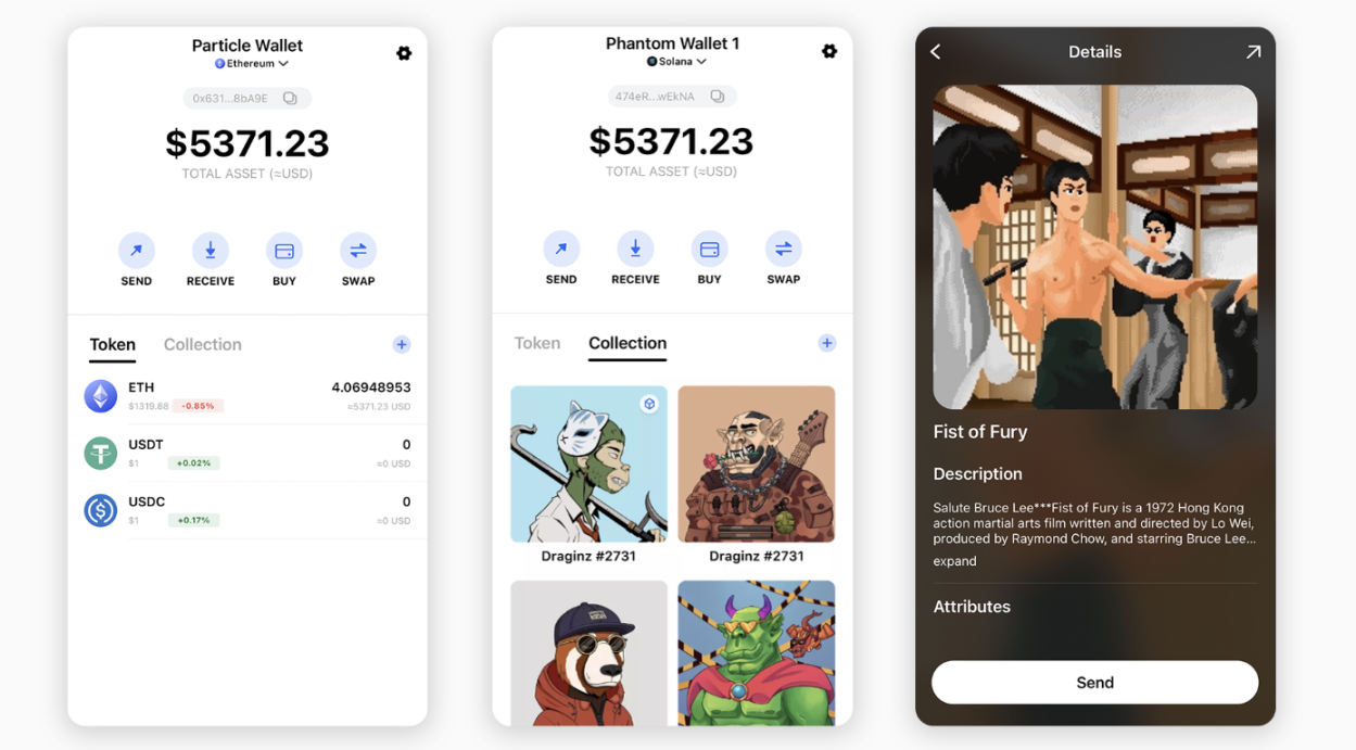 Particle Wallet 提供一站式钱包解决方案,Particle Wallet 并不是一个独立的钱包——而是一个插入应用程序或钱包的钱包基础设施。使用 Particle Wallet,用户可以集成根据自己本身的应用需求量身定制的钱包,其功能包括交易功能、NFT 显示等。
