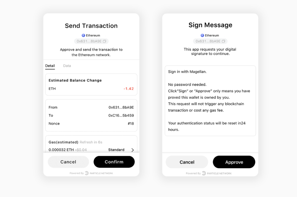 完整的 UI 界面:Particle Wallet 针对不同的应用风格和场景提供了多种高度适配的 UI 界面。
