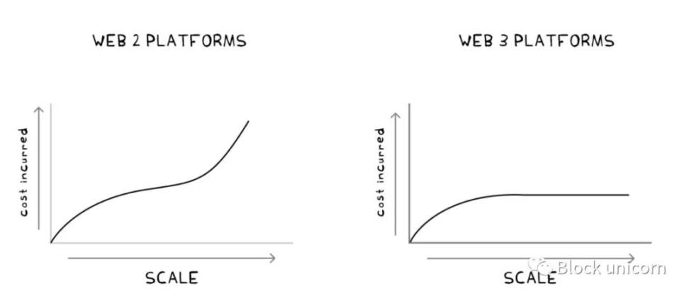 在传统市场,如亚马逊,或 Facebook 的广告市场,每一个新的市场互动的边际成本会随着更多的用户来到平台而上升,因为欺诈的可能性很高。即使在数字消费品中,如流媒体音乐(在 Spotify 上)或通过 Steam 销售游戏中的物品,边际成本也随着用户数量的增加而增加。当一个平台有一万个用户时,你所做的欺诈检查与一个有一百万个用户的平台所要求的明显不同,区块链倾向于将这种成本压缩到零。