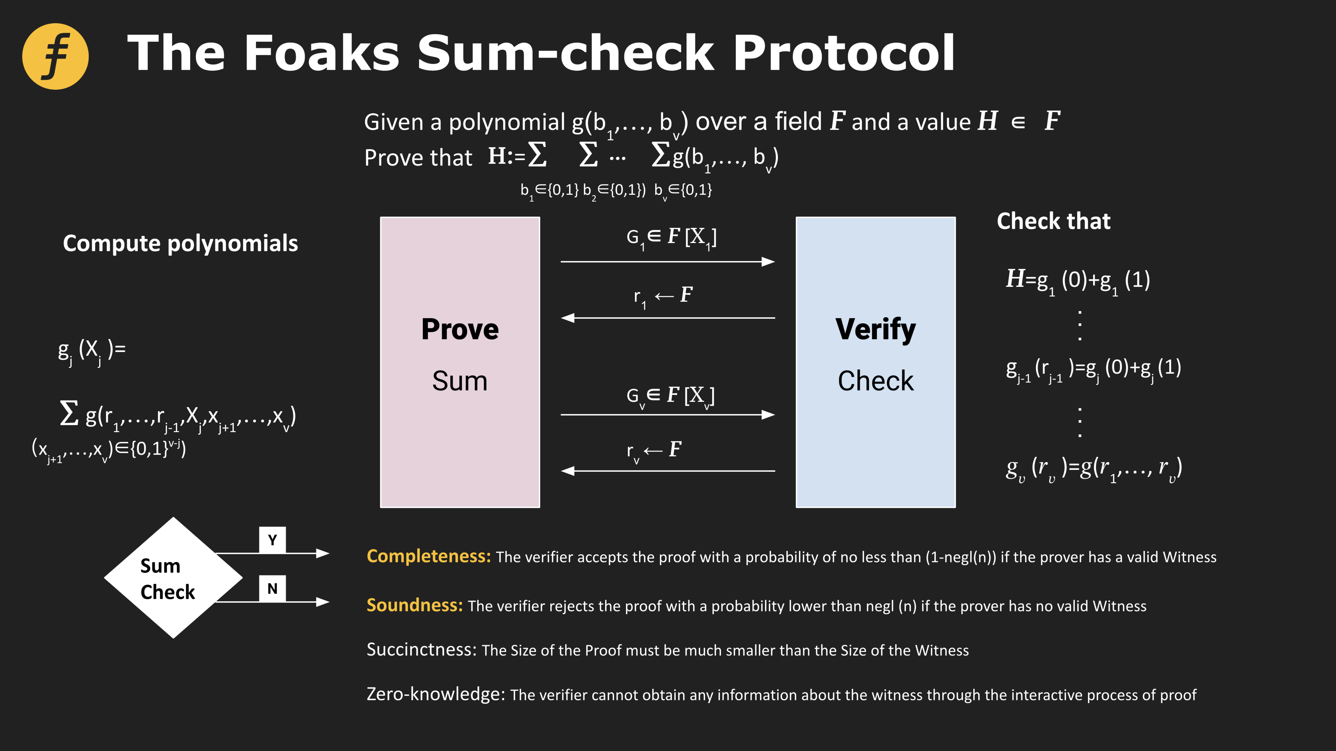 上述的每一种协议,协议目标是相同的,就是证明者(Prover)希望在不向验证者(Verifier)透露任何关于自己的秘密的信息的情况下让验证者相信自己拥有秘密。sum-check protocol 是很多协议的组件,最早在[LFKN 92 ]当中被提出。很多计算问题可以被转化成 sum-check protocol 能处理的问题,从而生成证明。包括 Foaks 在内的不少协议的底层协议都基于 sum-check protocol,在其上进行调整来实现。