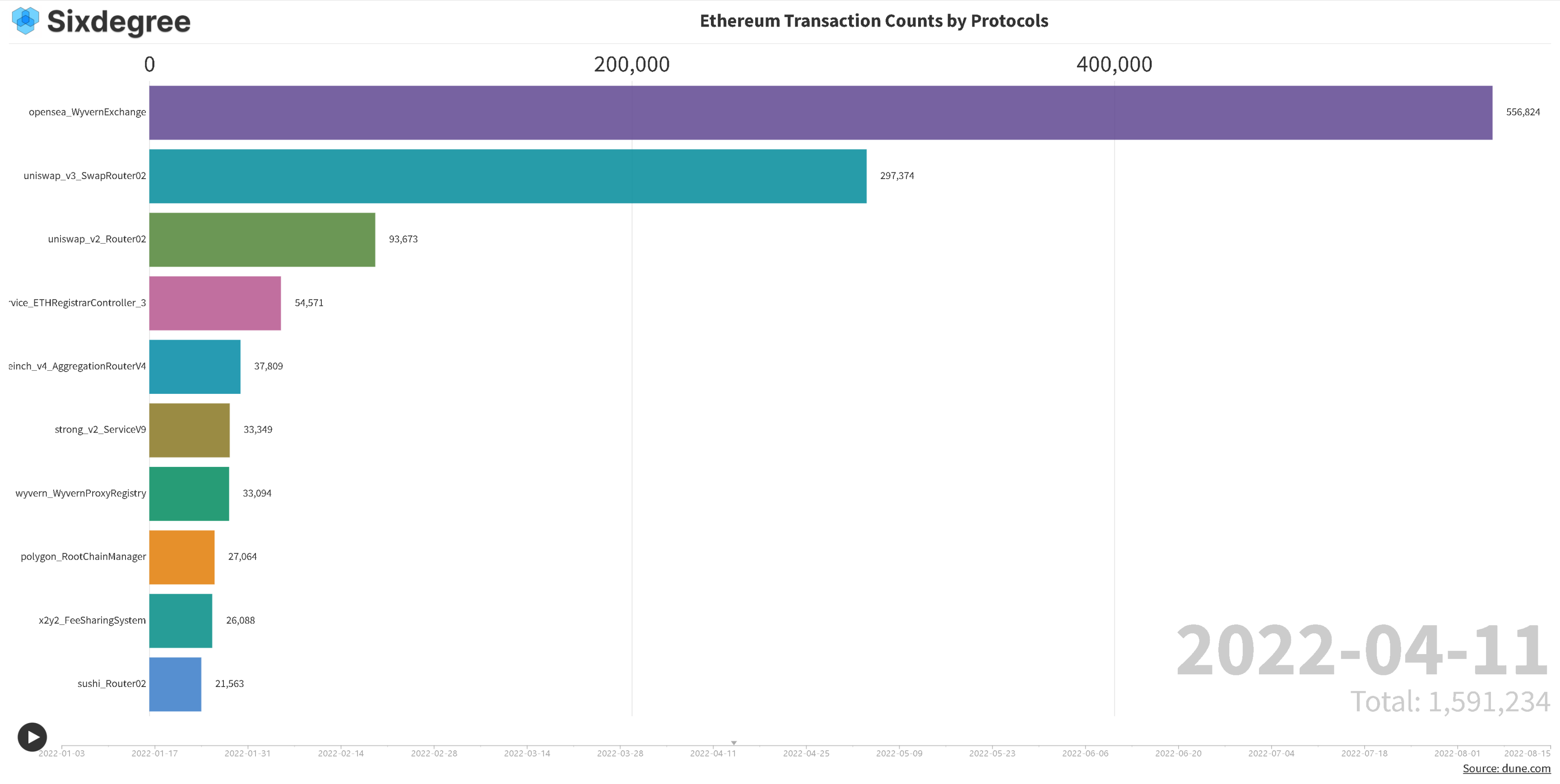 We are curious about which contract has been interacted most, i.e., which protocol is most popular on Ethereum? Thus, we listed top 10 protcols on Ethereum. The answer is, OpenSea and Uniswap are the most popular protocols on Ethereum, which is not surprised.