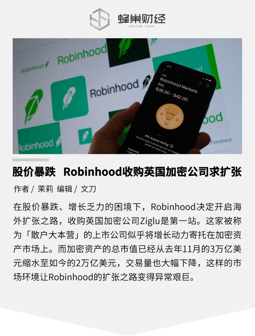 4月19日,美国金融服务企业Robinhood宣布收购英国加密资产公司Ziglu Limited,后者的产品支持英国客户购买11种加密资产。在这起收购案的新闻稿中,Robinhood直言,Ziglu的团队和技术将帮助他们加密在英国和整个欧洲的国际扩张。