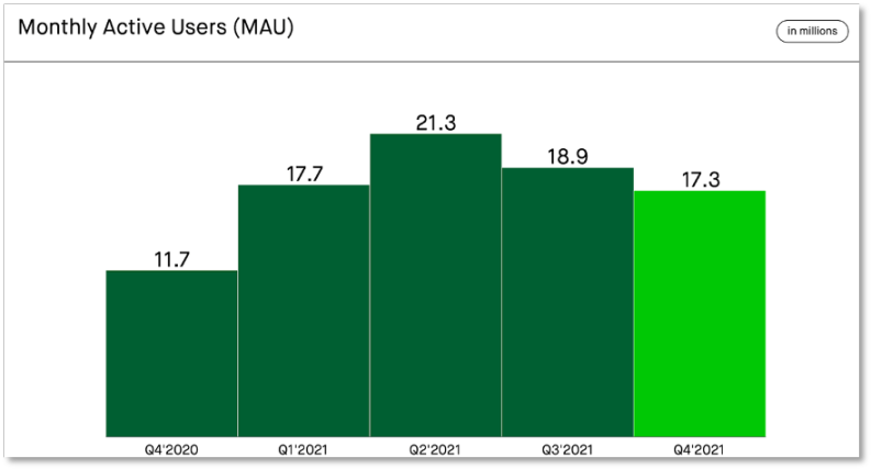 Ziglu在英国发展势头的确是Robinhood急需的,特别是在用户市场的补充层面。去年,著名的GameStop 和 AMC Entertainment 的散户逼空大战为Robinhood带来了交易狂潮,但自那之后,该公司的用户活跃度下降,2021 年第四季度,该公司的交易平台月活降至1730 万,较第三季的1890 万下降了8.46%。
