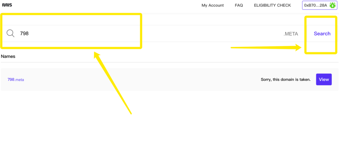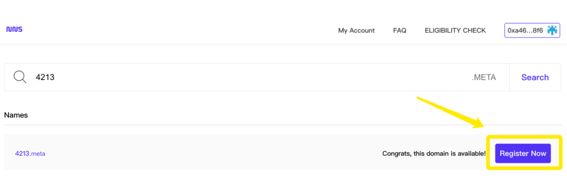 3. 在网页中央对话框内输入想要的 .meta 域名,点击 Search