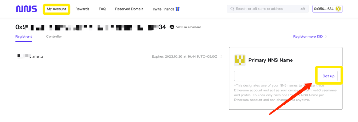 在 My Account 页面中 Primary NNS Name 板块点击 Set up,进行主域名设置,域名即可被后续解析与使用。