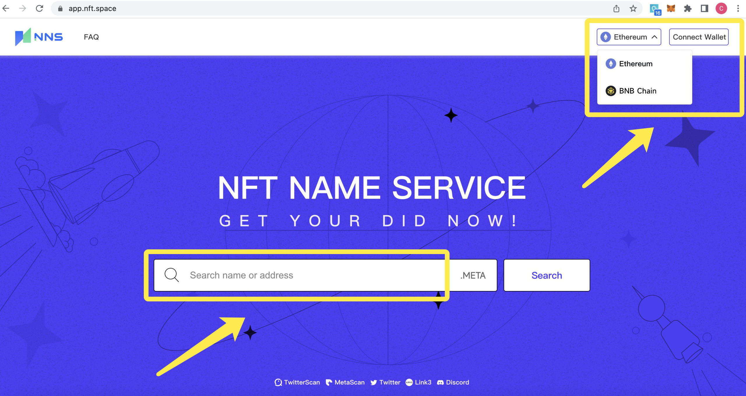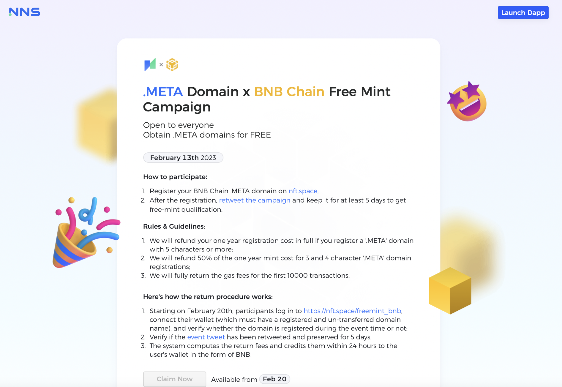 1. 访问NNS官网 nft.space,在首页点击本次活动图标(.META Domain x BNB Chain Free Mint Campaign),页面跳转至活动详细规则,请仔细阅读规则后,点击页面右上角Launch Dapp,跳转至注册页面。