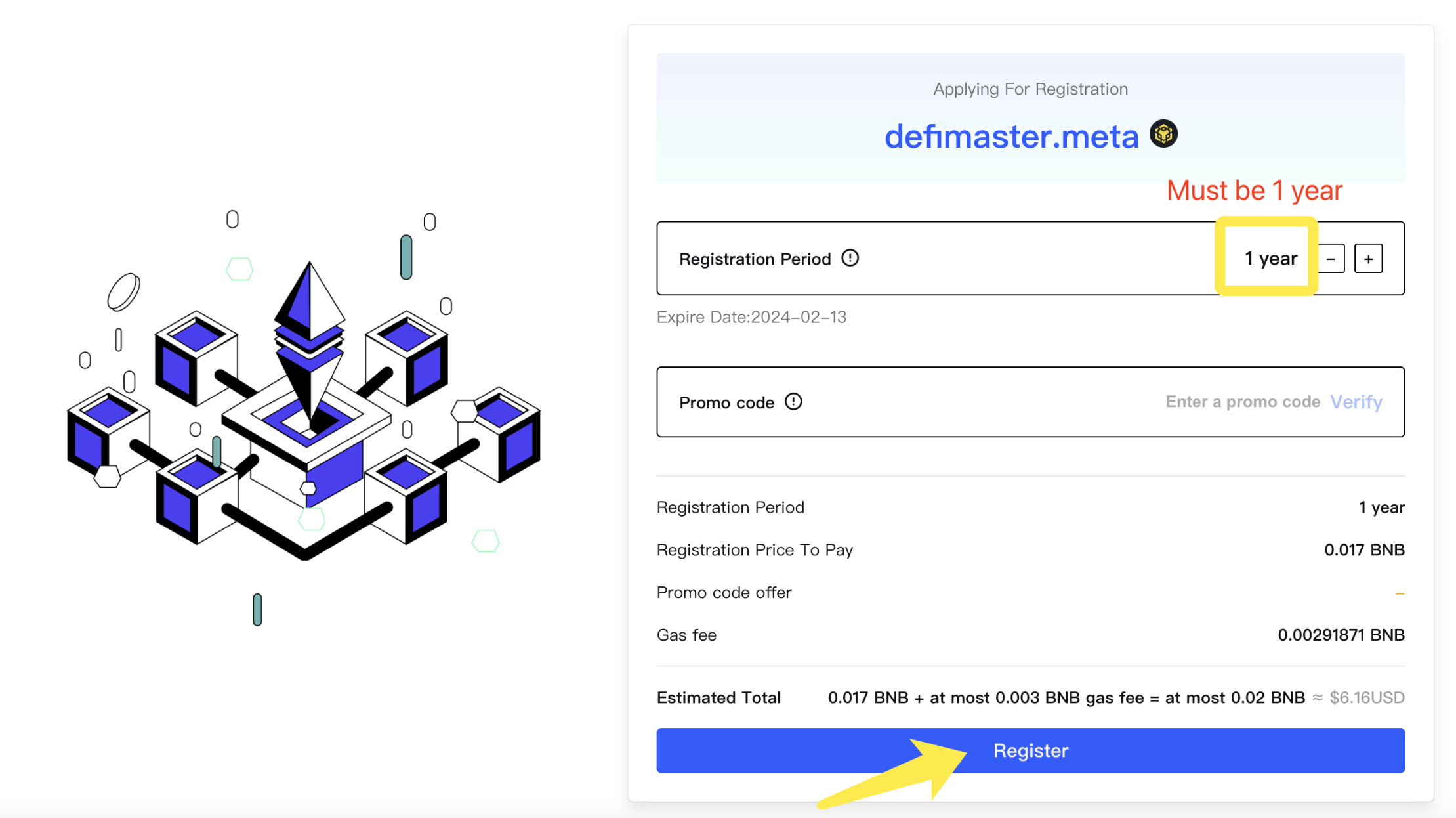 参与本次活动,注册的域名需为 1 年有效期的 . meta 域名。如果 .meta 域名注册年限为大于 1 年,则不能参与本活动,注册相关费用将不被返还。