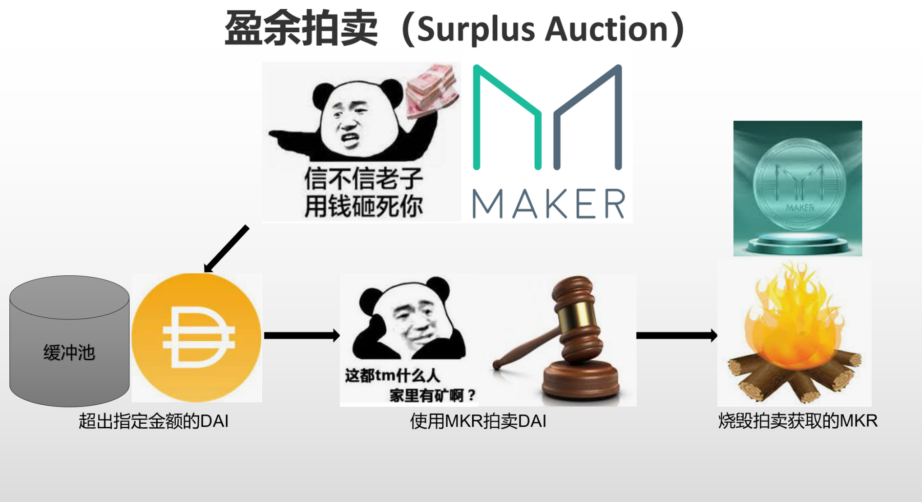** 盈余拍卖(Surplus Auction)机制:** 当缓冲池中的 DAI 累积到一定金额时(Maker 治理决定的值),超出的 DAI 就会被盈余拍卖(Surplus Auction),在盈余拍卖(Surplus Auction)时,拍卖者可以使用 MKR 来拍卖获取固定数量的 DAI,价高者得,一旦盈余拍卖(Surplus Auction)结束,拍卖所得的 MKR 将会全部被协议自动销毁,从而减少 MKR 的总供应量。