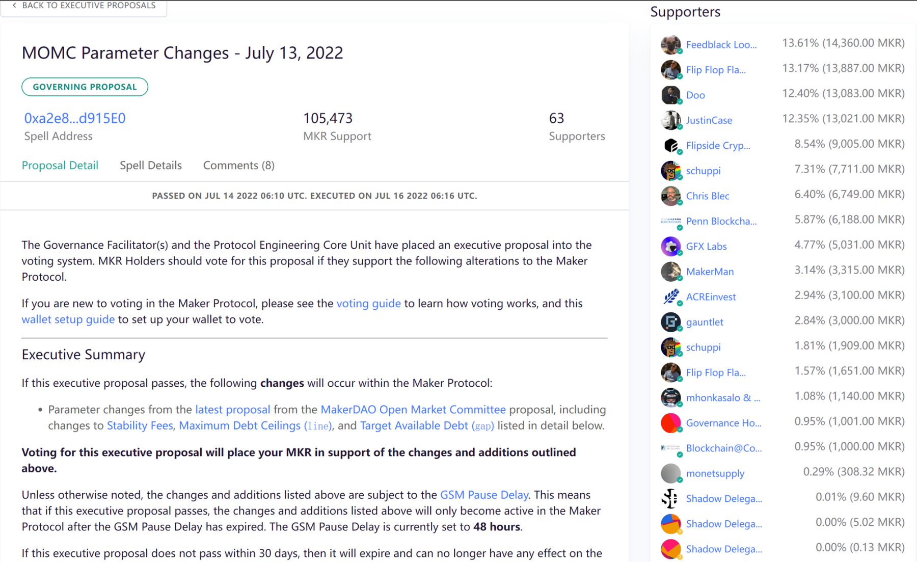 在了解完 MakerDAO 的治理流程后,我们可以观察 MakerDAO 治理的实际情况,截止至 2022 年 7 月 26 日最新的一个 MakerDAO 治理提案