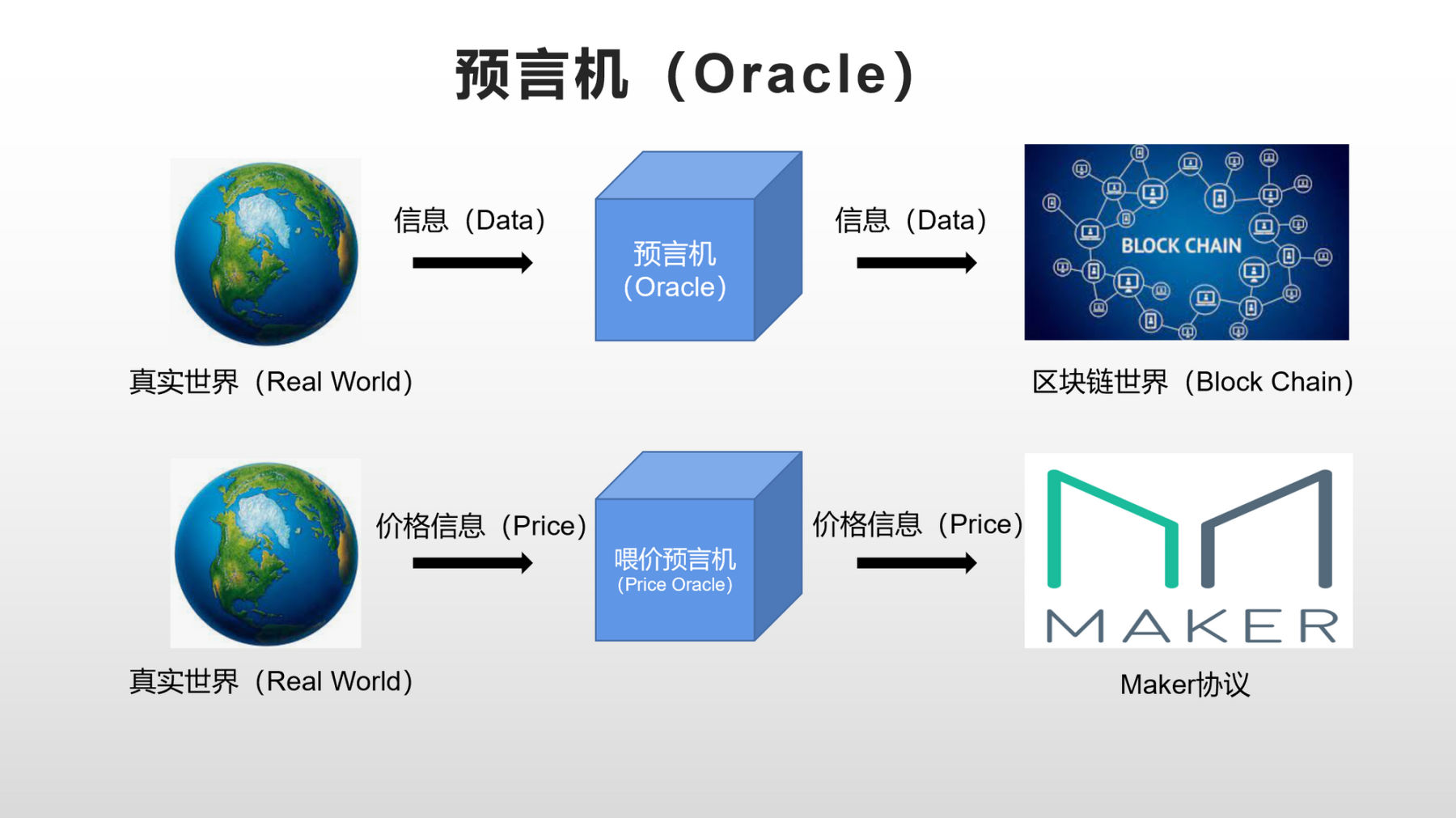 区块链的世界与现实中的世界其实是不互通的,那么这个时候需要有一个桥梁来让两个世界产生联系,Maker 协议如何获取现实世界中这些加密资产的价格呢?这需要一个叫做喂价预言机(Price Oracle)的东西来实现。