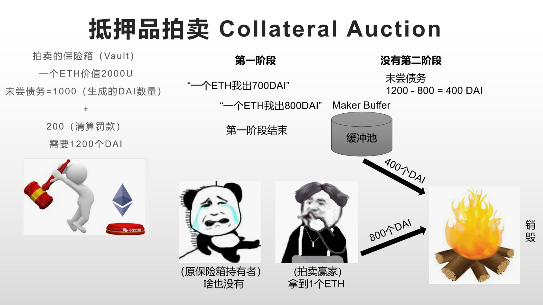 ** 担保品拍卖(Collateral Auction):** 在第一阶段担保品拍卖中,竞价者开始对拍卖的抵押品出价,最高价者支付 DAI 来低价获取抵押品,回购的 Dai 用来弥补金库的未偿债务及清算罚金。