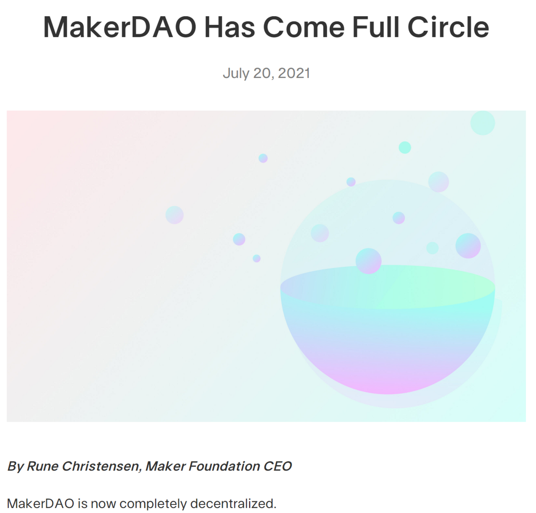 MakerDAO 创始人 Rune Christensen 在 2013 年 3 月第一次通过 Reddit 向世人展示了 Maker 的愿景,即创建一个由以太坊支持的美元稳定币,于 2014 年正式成立 MakerDAO 成为了以太坊上第一个去中心化自治组织(成立时间),2015 年 3 月 Maker 协议雏形诞生,创始人 Rune Christensen 在 Reddit 上与以太坊社区的成员包括 Vitalik Buterin 分享了协议的设计、合约代码以及测试前端,并且在 2015 年至 2017 年之间与来自全球的开发者开始了对代码、架构和文档的第一版迭代。2016 年中,MakerDAO 发布了以太坊上第一个去中心化交易平台:OasisDEX(现为 Oasis.app)。2017 年 12 月 MakerDAO 正式在以太坊上推出第一版 MakerDAO 白皮书向大家介绍了 DAI 稳定币系统。创始人 Rune Christensen 在 2021 年 7 月 20 日发布了一篇博客文章《MakerDAO Has Come Full Circle》宣布 Maker 基金会已经完成了它的使命并将会在未来几个月解散并完全交给社区管理实现了真正的去中心化。