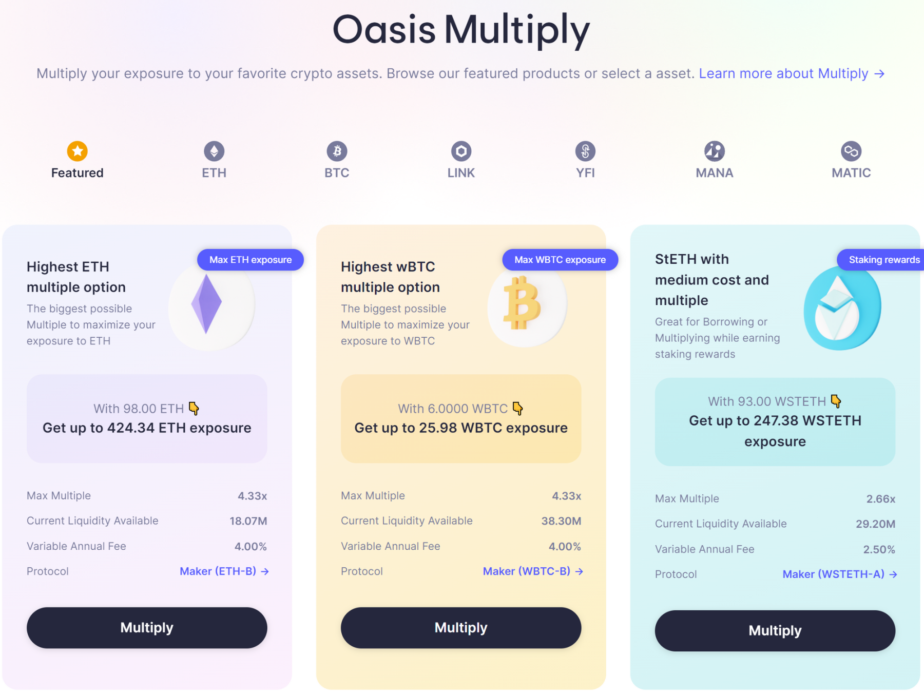 当用户创立一个保险箱(Vault)后,用户可以在 Oasis.app 上通过 Oasis Multiply 功能支付由 MRK 持有人指定的利息来借入 DAI 在保险箱中(Vault)购买更多的抵押头寸,这使得用户可以在抵押资产价值上升中获取更多的收益,但同时在面临资产下降时也会面临更高的清算风险