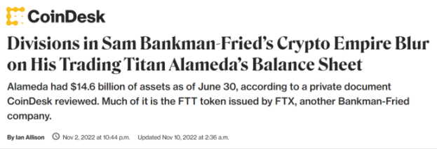 事件的导火索是加密行业知名媒体 Coindesk 于 2022 年 11 月 2 日发布的报告,称 FTX CEO Sam Bankman-Fried 掌管的对冲基金 Alameda Research 的大部分资产是关联公司 FTX 的代币 FTT,市场流动性差,存在严重的财务风险。6 日,Binance CEO CZ 公开宣布要清算价值 5.3 亿美元的 FTT,引发市场恐慌,导致 FTX 平台上的用户提款挤兑及 FTT 抛售,形成 FTX 的死亡螺旋。8 日,FTX 寻求 Binance 的求助。10 日,CZ 在尽调之后宣布放弃对 FTX 的收购,压断了拯救 FTX 的最后一根稻草。11 日,FTX 在美国申请 Chapter 11 破产重整,同时,Sam Bankman-Fried 辞去 CEO 职位。