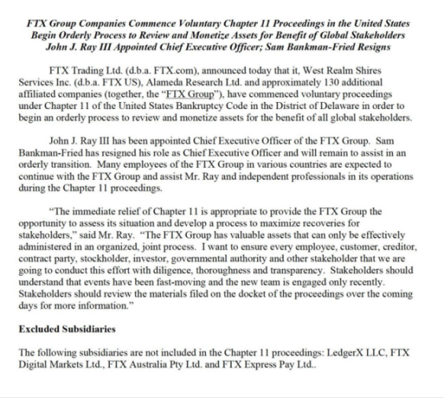 根据 FTX 发布的声明,FTX 已经根据美国《破产法》第 11 章破产重整(Chapter 11 Reorganization)向美国特拉华州破产法院提出破产保护的申请,涉及包括交易所 FTX.com、Alameda Research、FTX US 等 130 多个关联公司(FTX Group),以便「从全球利益相关方的利益出发,有序地评估和变现资产」。