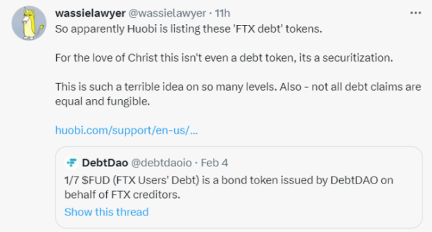 此外,如下图提到的 DebtDAO 发行的 Bond Token,即使其底层资产(FTX 债权)是有效的,但是这种发行资产证券化产品的行为,必然违反所有主要司法辖区的《证券法》,必然属于未经批准非法公开融资的行为,后果非常严重。