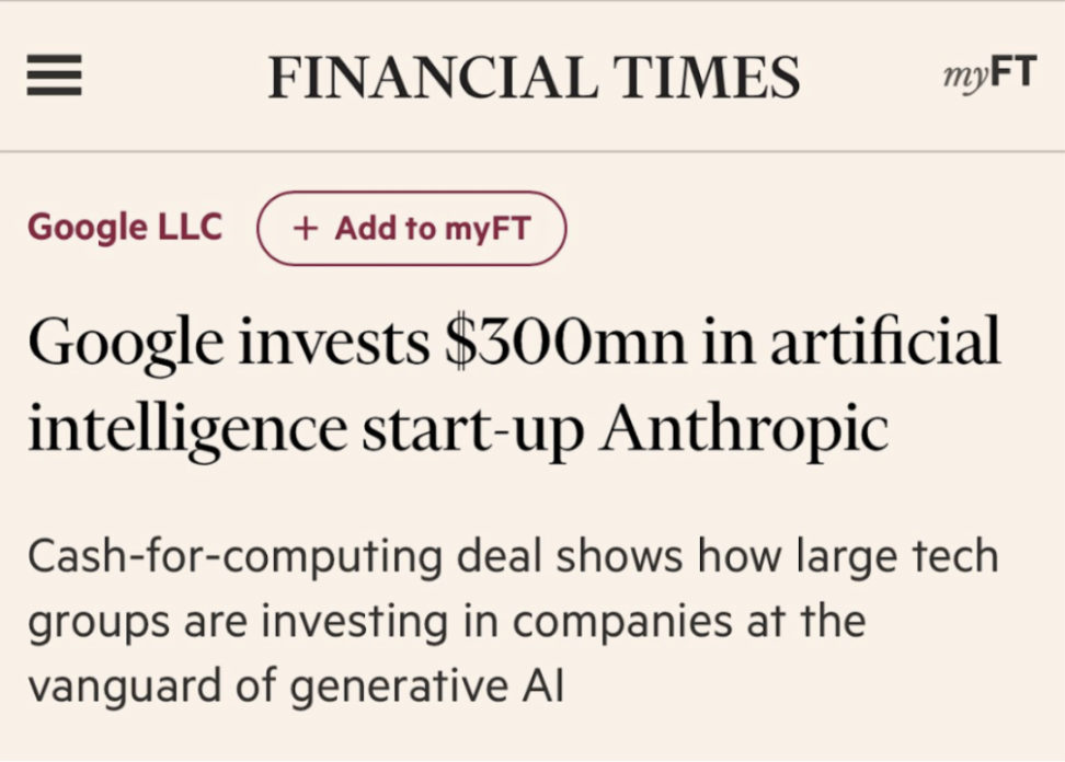 谷歌向人工智能公司 Anthropic 投资 3 亿美元谷歌已向人工智能初创公司 Anthropic 投资约 3 亿美元,据三位知情人士透露,谷歌将通过这笔交易获得约 10% 的股份,交易条款要求 Anthropic 用这笔钱从谷歌云计算部门购买计算资源。Alameda/FTX 此前向 Anthropic 投资约 5 亿美元。情报员评论: 前有 chatGPT,后有 Google 入场,AI 正在风口情报来源:https://www.ft.com/content/583ead66-467c-4bd5-84d0-ed5df7b5bf9c