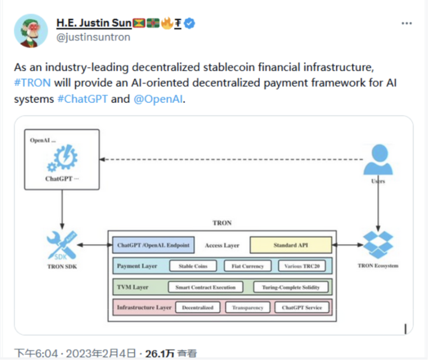 Justin Sun:波场 TRON 将为 ChatGPT 提供去中心化支付框架2 月 4 日,波场 TRON 创始人、火必 Huobi 全球顾问委员会成员 Justin Sun 在发推称:波场 TRON 将为 AI 系统 Chat GPT 提供去中心化支付框架,框架涵盖链上智能合约体系、支付层协议、底层调用 SDK 和 AI 支付网关。情报来源:https://twitter.com/justinsuntron/status/1621811959883776003