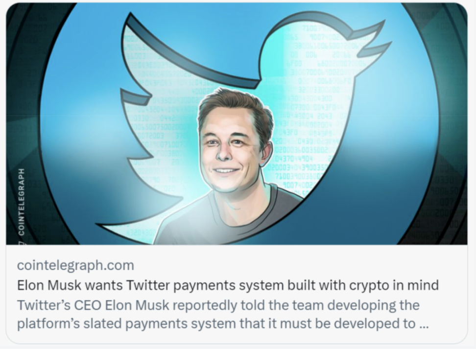 消息人士表示,Twitter 已经开始在美国各地申请监管许可证,并设计在其平台引入支付所需的软件。两位消息人士表示,Elon Musk 曾表示希望该系统首先支持法定货币,但在构建时要考虑到以后可能会添加加密支付功能。情报员评论: 马斯克对微信这种全能怪兽的推崇不是一天两天了情报来源:https://twitter.com/Cointelegraph/status/1620338735681355776