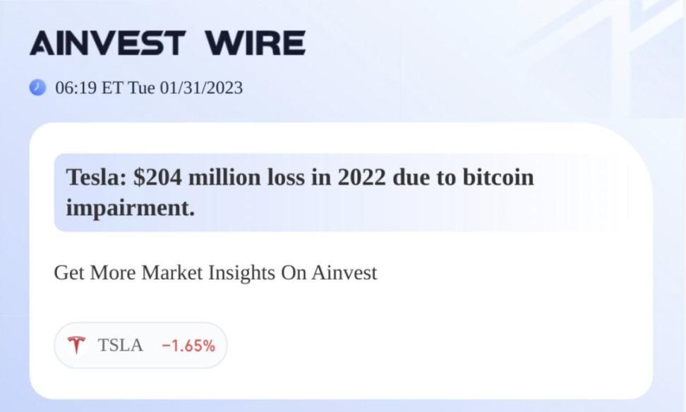 特斯拉:2022 年因比特币减值损失 2.04 亿美元在 2021 年第一季度,特斯拉在比特币上总共投资了 15 亿美元。特斯拉表示,即使这些资产的整体市场价值增加,也可能对其减值期间的盈利能力产生负面影响,截至 2022 年年底产生了 2.04 亿美元的减值损失。情报来源:https://twitter.com/Ainvest_Wire/status/1620381267022827521