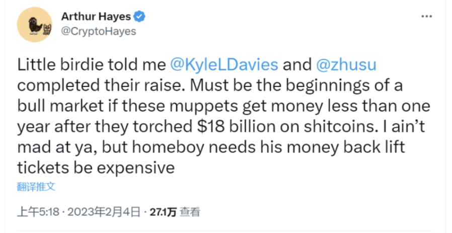 三箭资本创始人新 CEX 项目“GTX”已完成融资BitMEX 创始人 Arthur Hayes 发推表示,有消息称,由原三箭资本创始人 Su Zhu 与 Kyle Davies 联合 2 位 CoinFLEX 联创新建立的 CEX 项目“GTX”已完成融资。情报来源:https://twitter.com/CryptoHayes/status/1621619143777853440